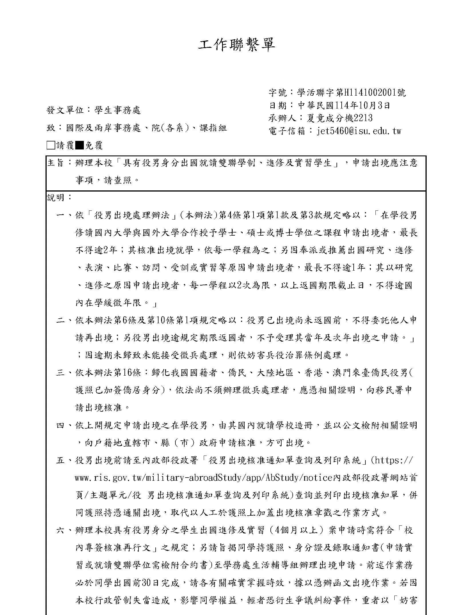 辦理本校「具有役男身分出國就讀雙聯學制、進修及實習學生」申請出境應注意事項