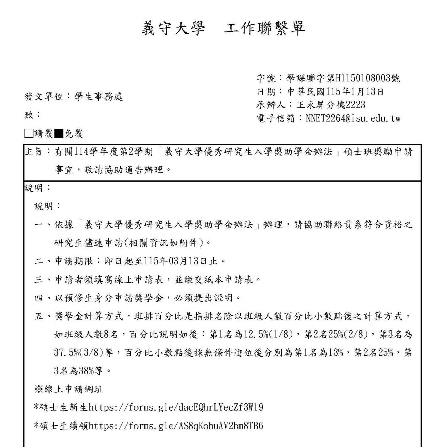 114學年度第2學期「義守大學優秀研究生入學獎助學金辦法」碩士班獎勵申請事宜(受理期限至2026/3/13止)