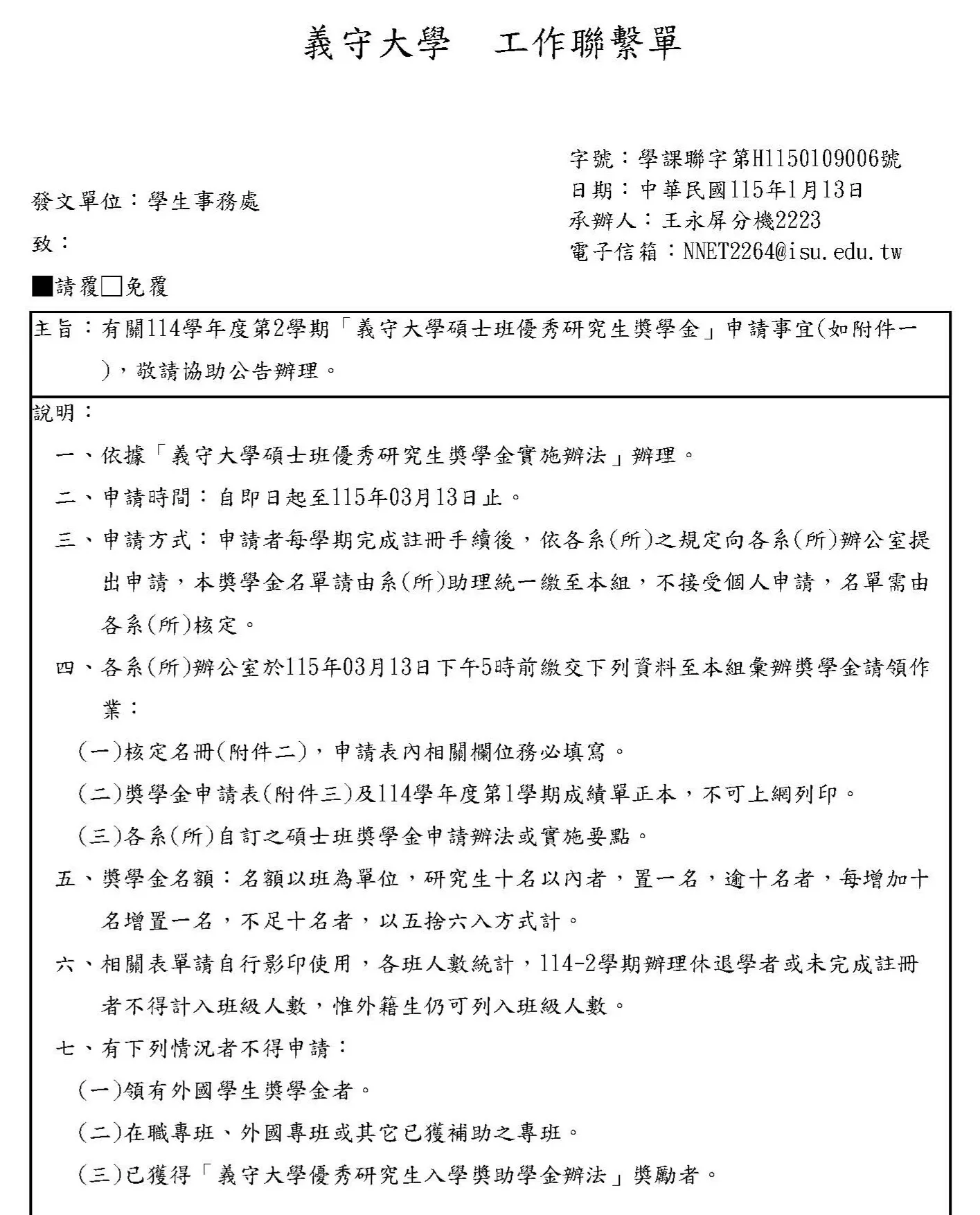 114學年度第2學期「義守大學碩士班優秀研究生獎學金」申請事宜(系辦受理期限至2026/3/6止)