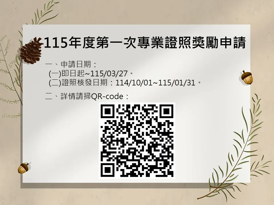 依據「義守大學學生取得專業證照獎勵實施辦法」辦理由學生本人於申請期限內至線上申請系統填寫相關資料,並上傳證照證明文件。 請申請人特別留意郵局帳戶資料是否正確,以免影響後續獎勵金撥款作業。 上述申請作業請務必於期限內完成,逾期恕不受理,亦不得補申請前一期之證照獎勵。 申請期程自即日起至115年3月27日止 可申請之證照核發日期區間為114年10月1日至115年1月31日