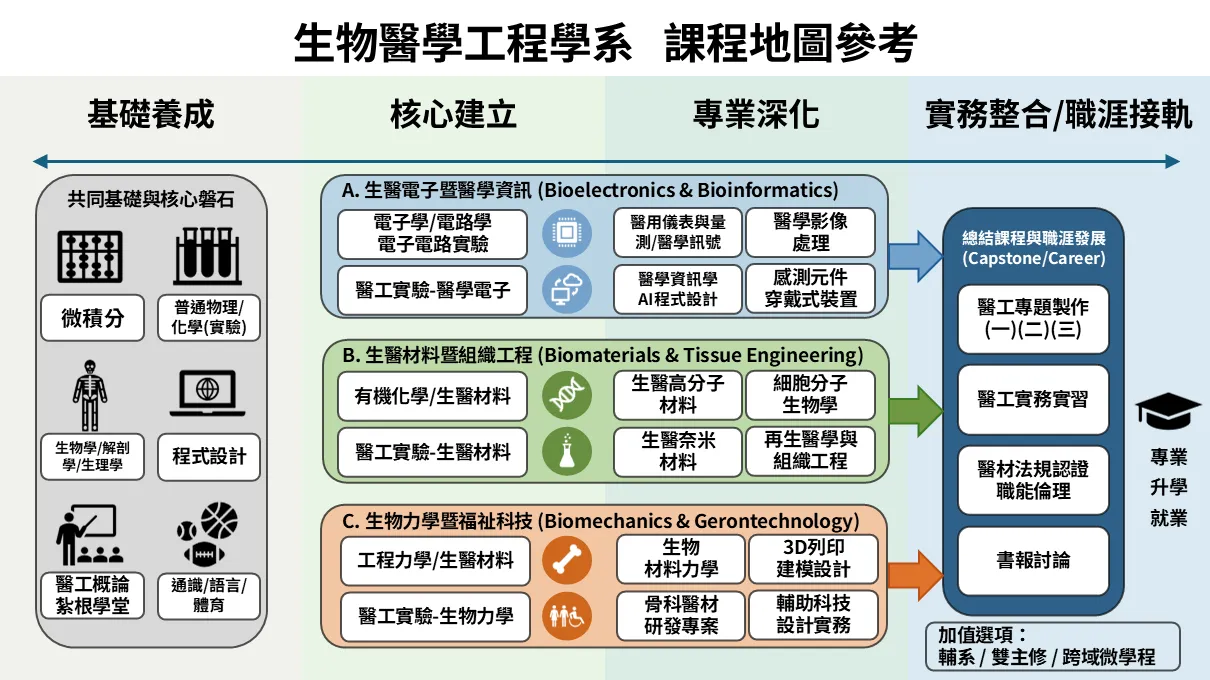 本系課程由淺入深規劃:紮根學堂認識醫學工程與產業需求;深碗課程強化醫工專業與實務操作能力;X+AI課程將AI技術與醫療應用對接;主題式課群以小型醫療裝置設計與製作出發,培養能實作、懂應用的醫工專業人才。